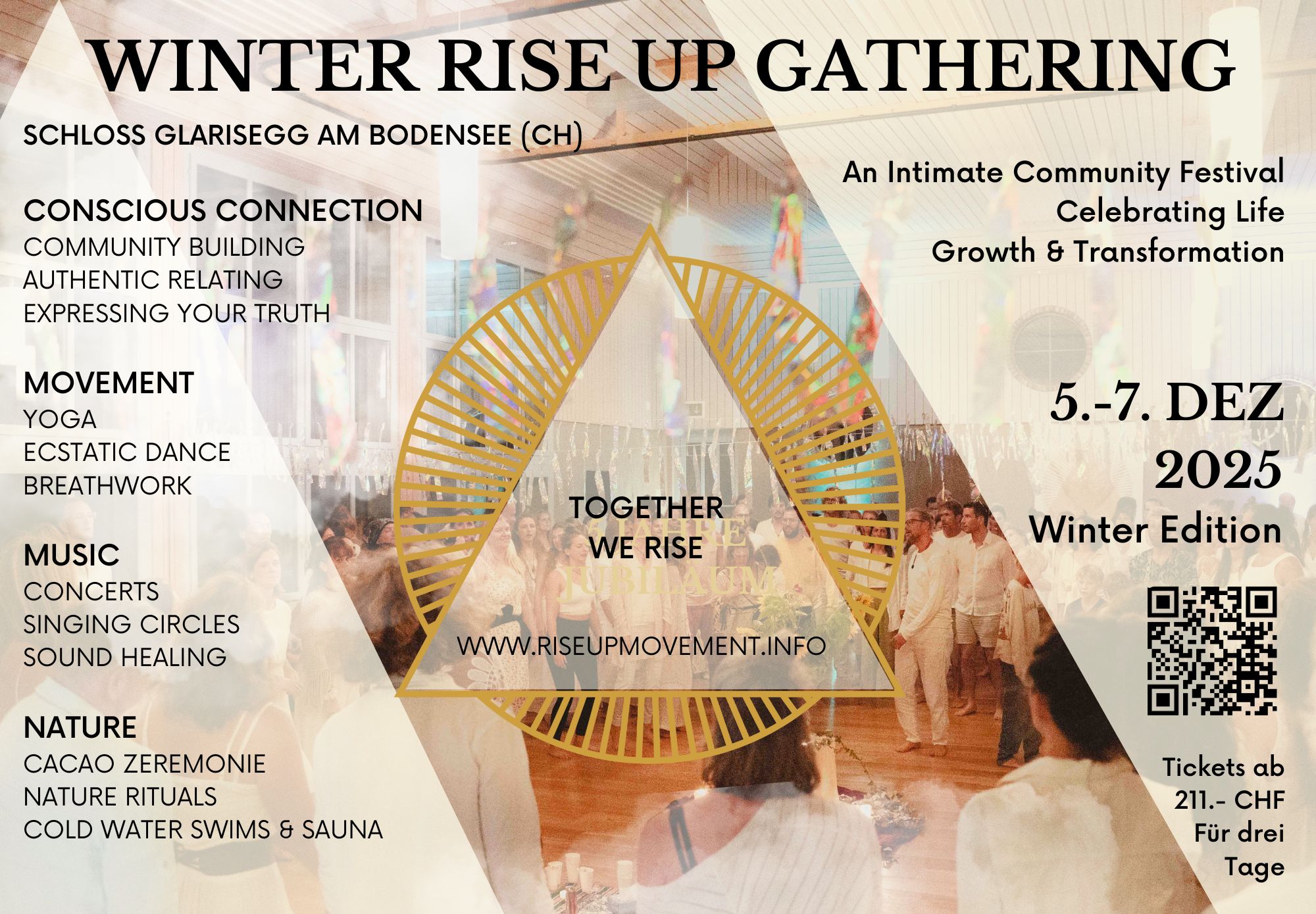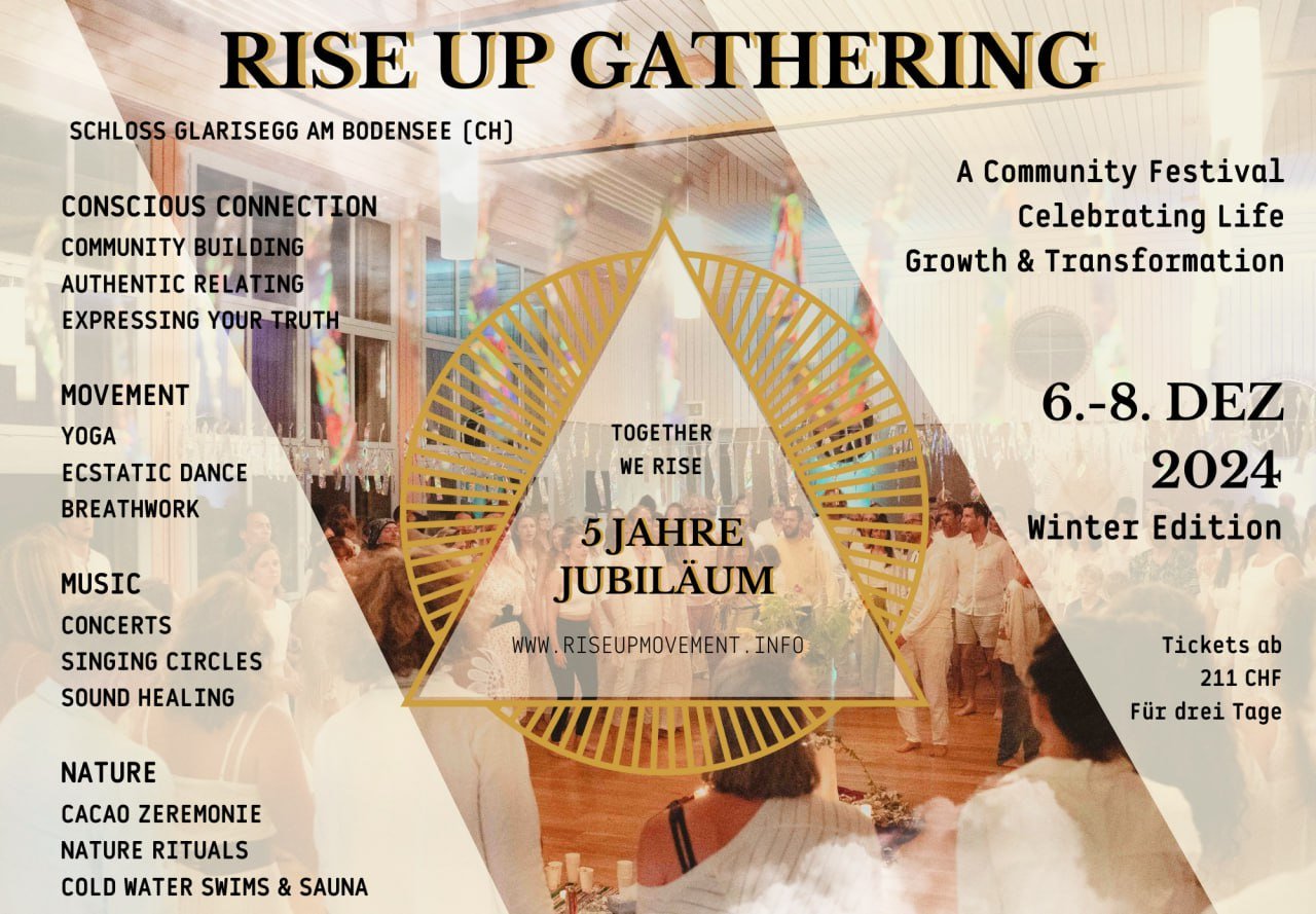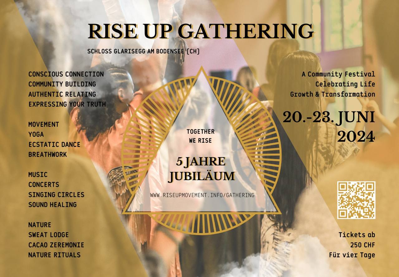Das RISE UP GATHERING lädt dich ein, vom Donnerstag 26. Juni – Sonntag 29. Juni 2025 das Leben in all seinen Formen zu feiern und dich mittels kraftvollen Bewegungstechniken und transformierenden Übungspraktiken wie Yoga, Ecstatic Dance, Breathwork, Conscious Connection, Kakao und Feuer-Zeremonie und vielem mehr zu inspirieren.